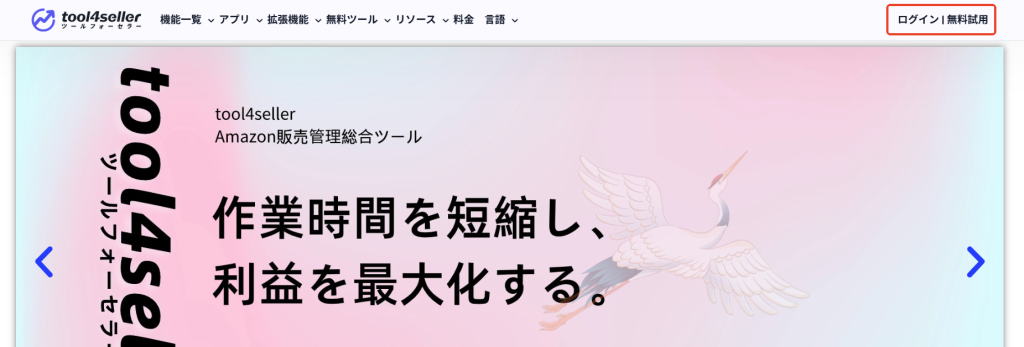 tool4sellerのホームページの右上隅にある「ログイン」ボタンをクリックして登録ページに入り、新しいアカウントを作り上げます