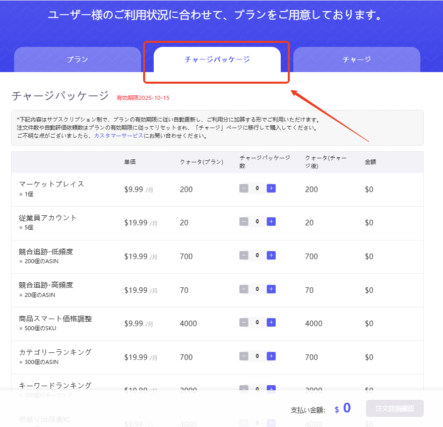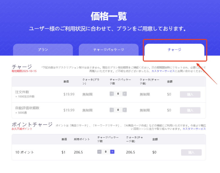 注文数2000件を超えたら、ぜひチャージパッケージを活用してください。
