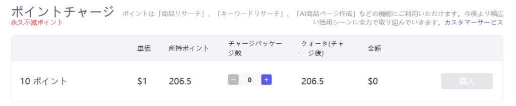 また、フリー、ベーシック、14日間無料試用のプランでは、AI商品ページ作成、AI評価分析、商品意匠権検索など、一部の機能が ポイント で一回ごとの利用が可能です。10ポイントが$1かかり、購入後永久不滅ポイントになります。